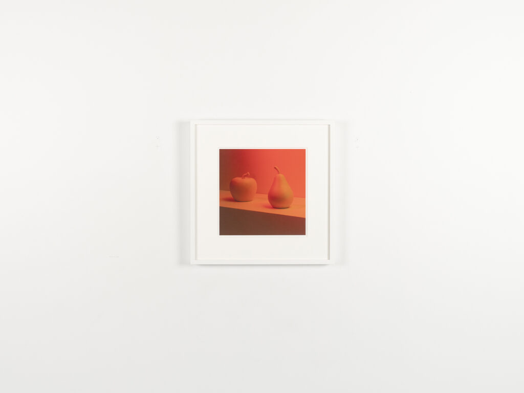This image consists of an oversized white plaster apple and pear that I found at thrift store. I used red and green lighting gels to superimpose common pear and apple colours back onto the objects.