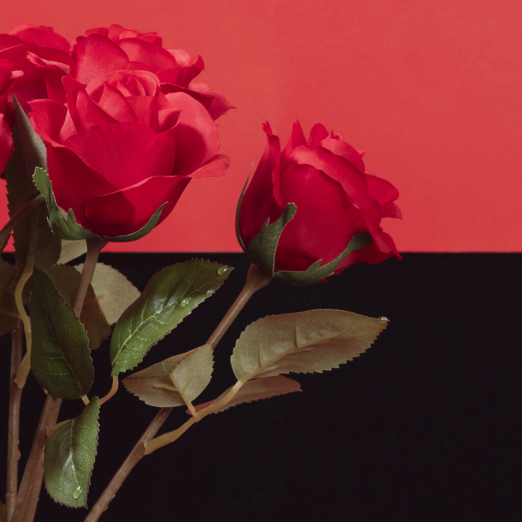 A still life of a “forever-fresh” artificial roses with faux raindrops carefully placed on the flowers and petals to imply freshness. Surrounded by plastic and made of plastic, the flowers have the potential to last indefinitely.